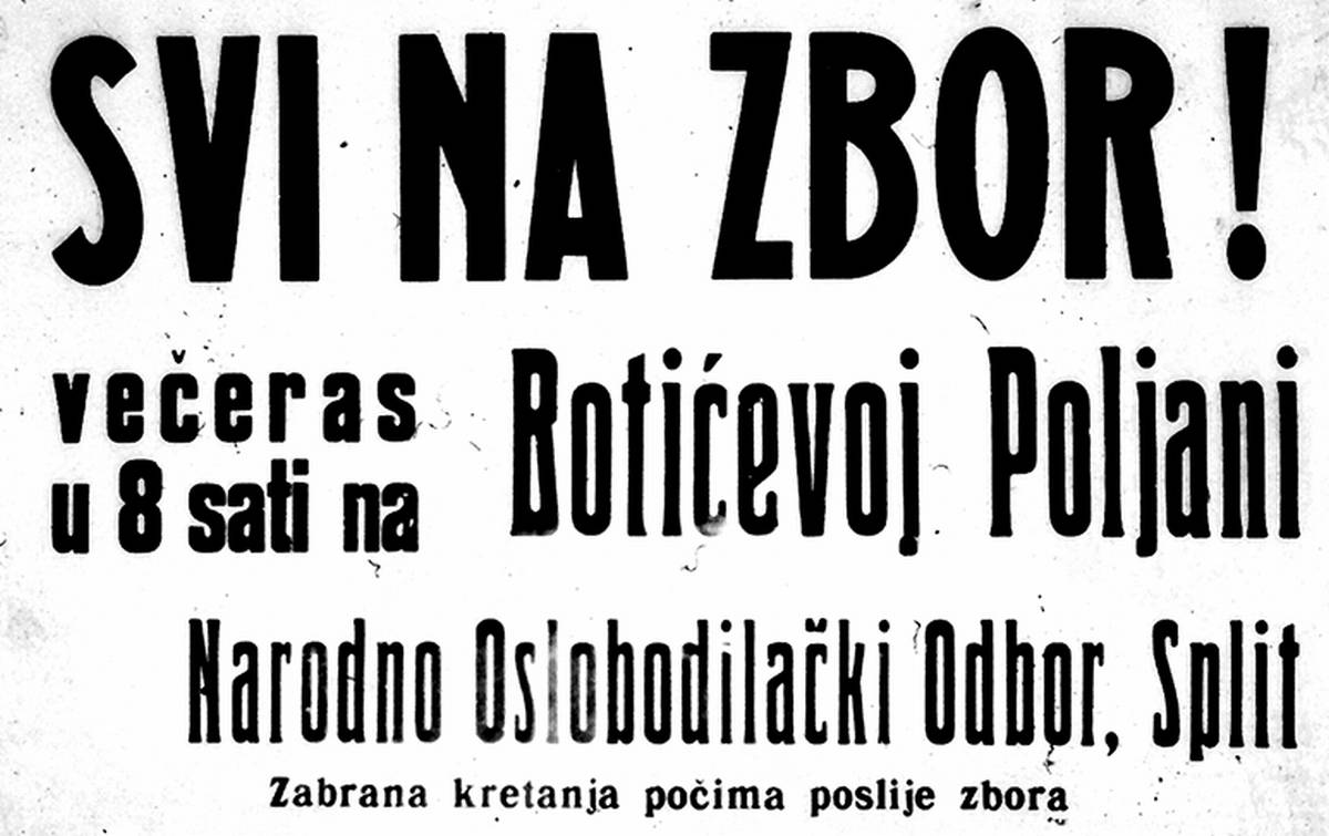 - Prema pozivu NOO u Splitu pozvani su pristaše HSS-a, SDS-a i jugoslavenskih nacionalista, da zaborave sve međusobne razlike i da se zbiju u čvrste redove te stupe pod Vodstvo NOO-a. Da večeras u 19 sati manifestiraju svi po ulicama Splita.