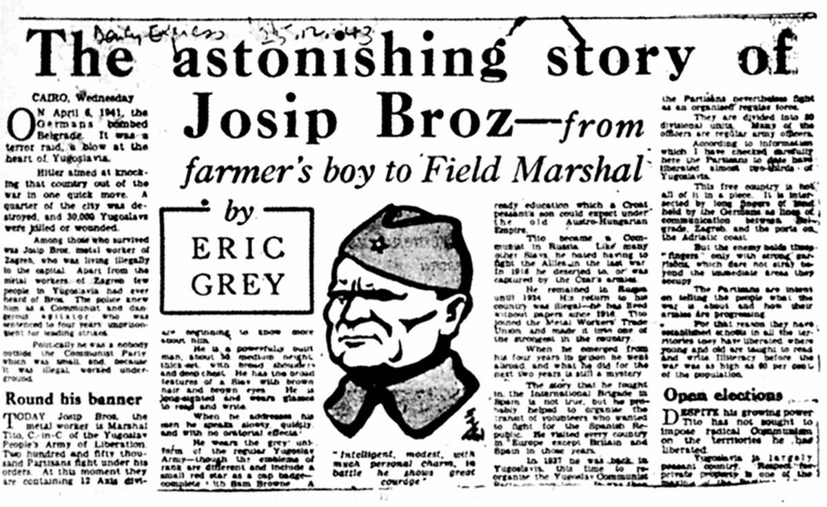 Priča o Josipu Brozu. Londonski dnevnik Daily Express: »Zadivljujuća priča o Josipu Brozu – od djeteta sa sela do feldmaršala«, napis Erica Graya, ratnog dopisnika lista