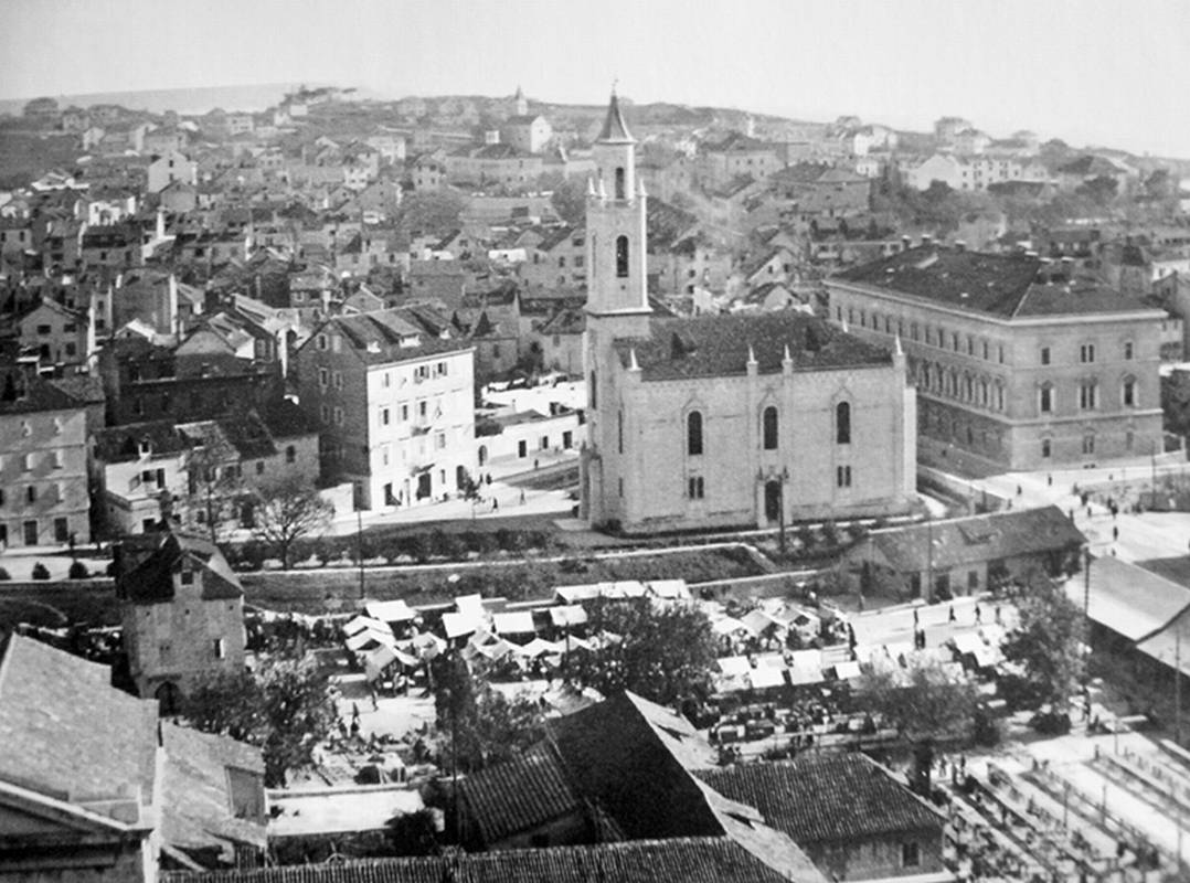 Splitski Pazar prije rata (u drugom planu crkva sv. Petra; snimka je učinjena prije izgradnje kuće Ivanišević, odnosno zgrade gdje je bilo uredništvo i tiskara Slobodne Dalmacije)