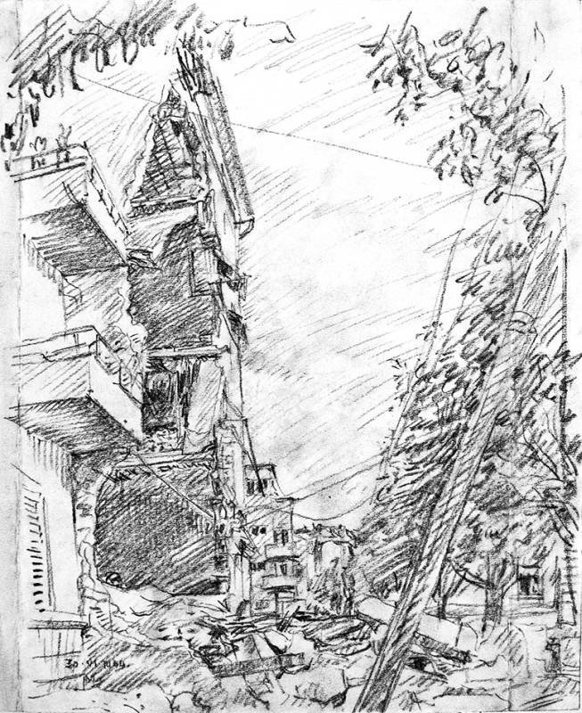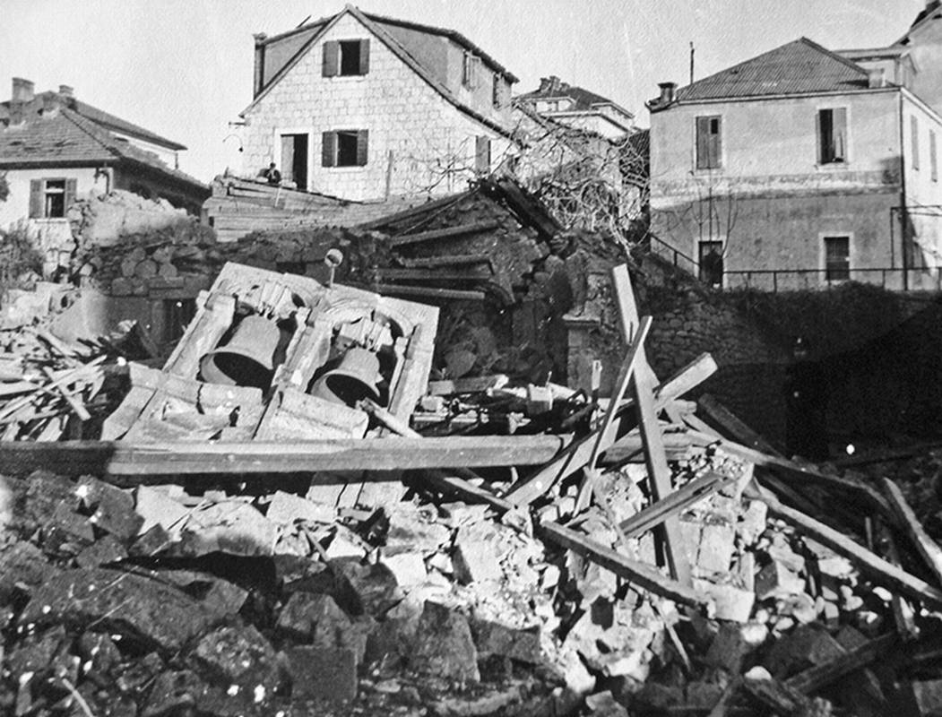 - Tek zadnje bombe prasnuše u našoj neposrednoj blizini i skrhaše do temelja susjednu crkvu svetog Roka s takvom orljavom, da smo mislili da nam se naša kuća ruši nad glavom, od pustih greda i kamenja koje je popadalo po krovu i ulici, i od rasprsnutih stakala u samom skloništu. Na ulici bijaše od dima i prašine zagušljivo i tamno kao u paklu. Pljujući žutu prašinu tražimo zraka i usred dana jedva raspoznajemo ljude u neposrednoj blizini. I svi trče, bježe, ne znaju ni sami kamo. Svatko traži svoje najmilije. Trčeći preskaču preko greda, kamenja i dijelova pokućstva razbacanih po našoj ulici. Već odvode prve ranjenike iz gužve. Bego