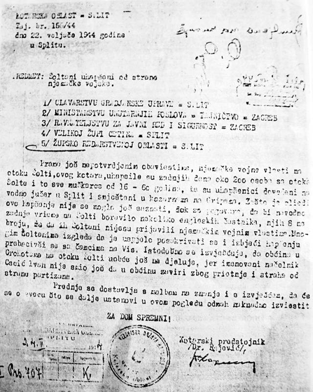 - Vlast je neosporno čitava u njemačkim rukama. I sami ustaše izjavljuju u povjerenju da u Splitu stvarnu vlast ima Gestapo. U pogledu proganjanja i teroriziranja građanstva nije do sada poduzeto ništa, tj. njemačke, kao i ustaške vlasti, provode ovdje »blagu« politiku i taktiziraju s narodom … Prisiljeni su blago postupati, vjerujući da će se izvjesni broj partizana vratiti, a kod građanstva žele barem ublažiti mržnju prema sebi.