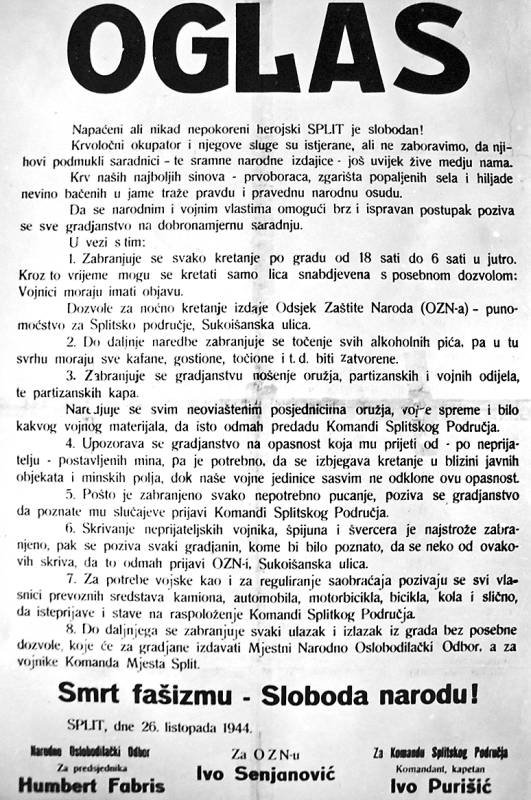 - Narodnooslobodilački odbor Splita i Komanda splitskog područja izdali su zajednički oglas u povodu oslobođenja grada: »Napaćeni, ali nikad pokoreni herojski Split je oslobođen! Krvoločni okupatori i njihove sluge su istjerani, ali ne zaboravimo da njihovi podmukli suradnici – te sramne narodne izdajice – još uvijek žive među nama … Zabranjuje se svako kretanje po gradu od 18 do 6 sati ujutro … i do daljnje naredbe zabranjuje se točenje svih alkoholnih pića, pa u tu svrhu moraju sve kavane, gostione, točione, itd. biti zatvorene…«