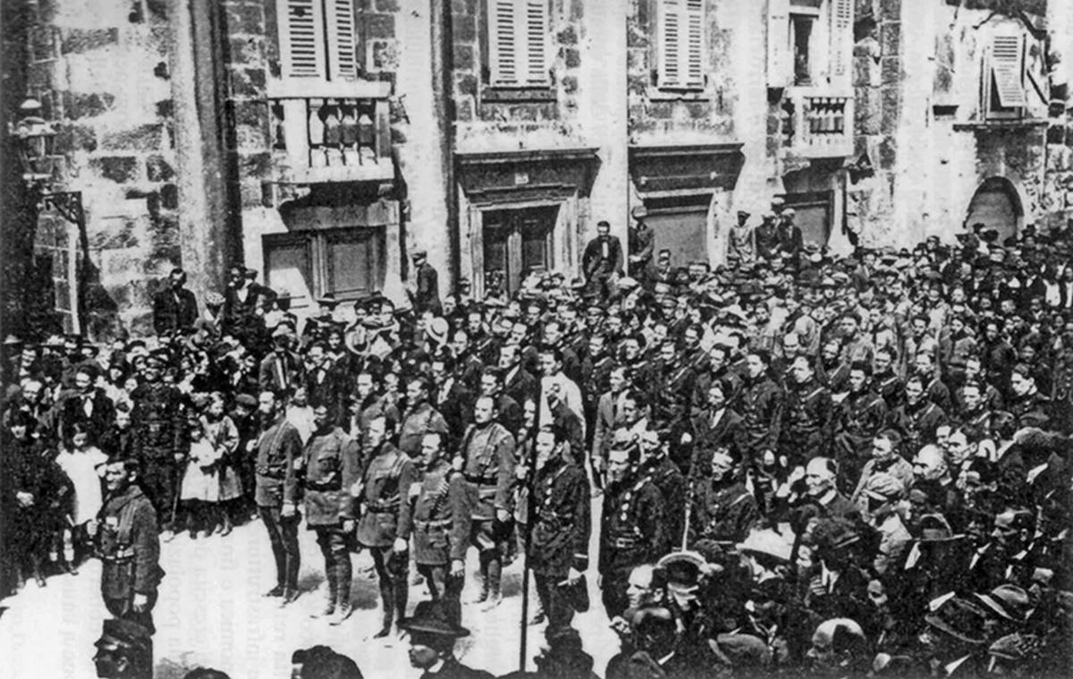 Postrojavanje četnika. Manifestacija Orjune na Peristilu 1924. Orjunaši su se posebno žestoko obračunavali s komunistima; Četnici na Peristilu dvadesetih godina prošlog stoljeća