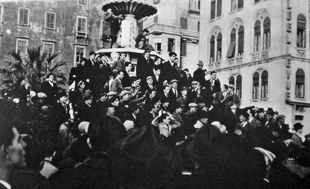 Antifašisti na Bajamontijevoj fontani. Antifašisti Splita i okolice održali su 17. prosinca 1939. masovne demonstracije protiv rata i jugoslavenskog profašističkog režima. Na mitingu je govorio Duško Mrduljaš