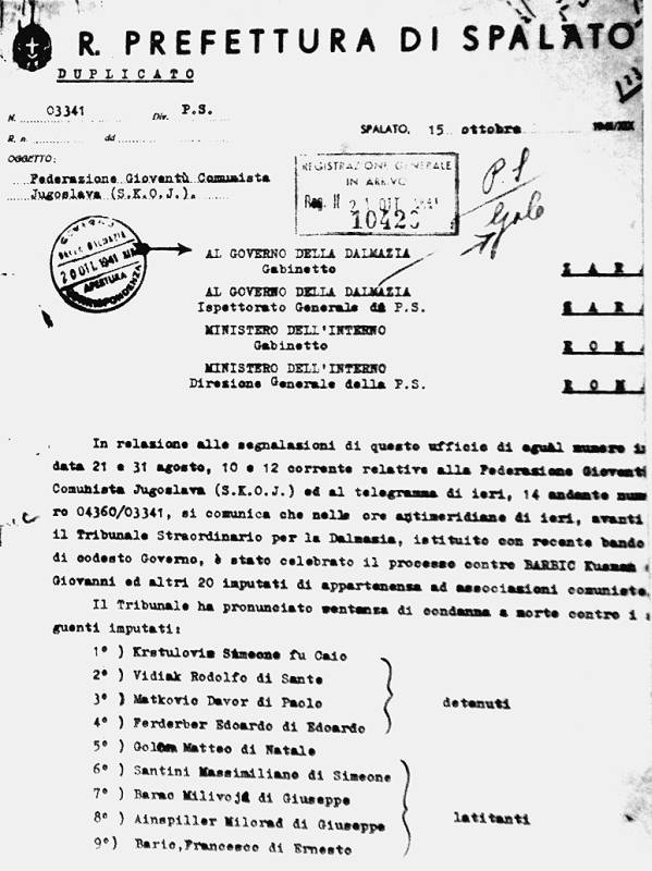 - Školski inspektor za splitsku pokrajinu u svom izvještaju o stanju u splitskim srednjim školama, gdje je bilo 1207 učenika, izvijestio je da su splitski učenici pod utjecajem »komunističke propagande«, da ne priznaju »ni Domovinu, ni obitelj, ni vjeru« i da se najviše bave sportom i politikom. Direktori škola smatraju da u školama postoje komunističke ćelije i da su neki učenici umiješani u teroristička djela. Njihov antitalijanski duh, izvještava inspektor, »manifestirao se 25. rujna 1941. povodom izdavanja svjedodžbi, kada su učenici zahtijevali svjedodžbe na hrvatskom jeziku. Učenici šaraju po slikama kralja i Mussolinija i vrijeđaju talijanske zastave… Prilikom upisa u novu školsku godinu upisalo se 20 posto manje učenika, roditelji povlače učenike iz škole …« Šepić, Zbornik br. 3,. 284., Kronologija