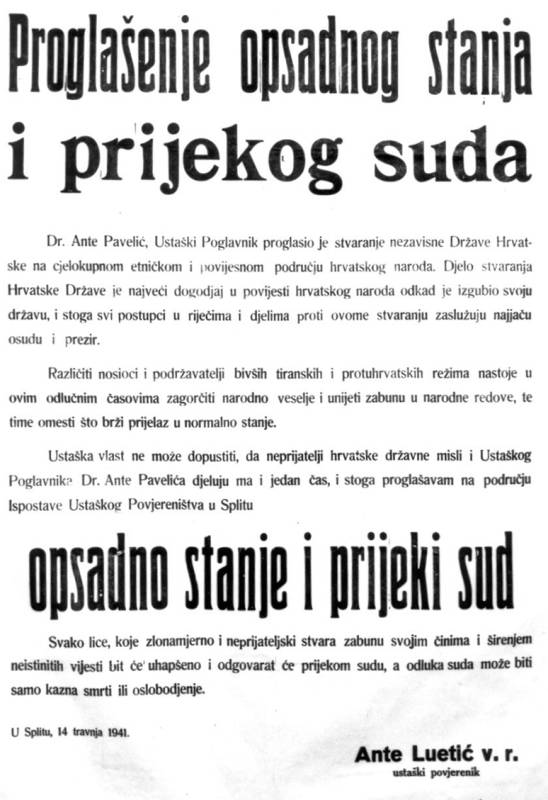 - Prvi postupci ustaške vlasti u Splitu bili su: odstranjenje dužnosnika u Banskoj vlasti, državnog redarstva, sudstva itd. Bansku ispostavu preuzima Luetić, redarstvo dr. Šimunić, sudstvo Vlaho Carević. Danonoćno su se skidale spomen-ploče i neodgovarajući nazivi ulica i postavljali novi nazivi: Bana Jelačića, Milana Luetića (ubijenog na Vagnju), Slavka Kvaternika, Adolfa Hitlera, Benita Mussolinija, itd. Kićenje ulica zastavama bilo je nenadmašivo, naročito Rive i Pjace. Svi uniformirani državni namještenici na kapama nose hrvatske kokarde.