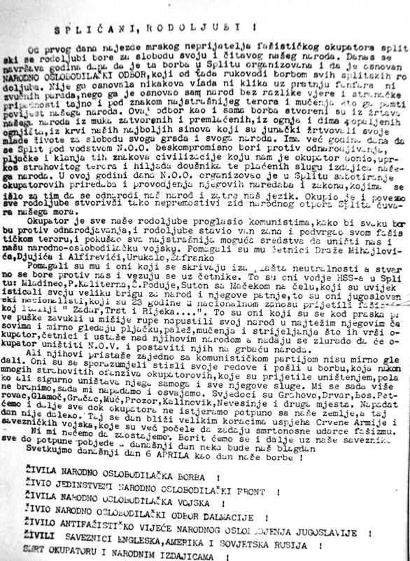 - Četnički nacionalni komitet u Splitu, u broju 8. svog biltena Krik iz jama prijeti Splitu zbog likvidiranja trojice četničkih bandita: »Komunisti su najavili rat do istrebljenja četnika … Komunistički Split, koji u ova tri slučaja mučkih napada na četnike klikće svojim junacima mraka, može da se spremi da dugo jauče … Splite, splitska većino … samo nosi novo drvlje na svoju lomaču, na kojoj ćeš izgoriti i sasuti se u prah i pepeo…«. Četnički arhiv, Kronologija