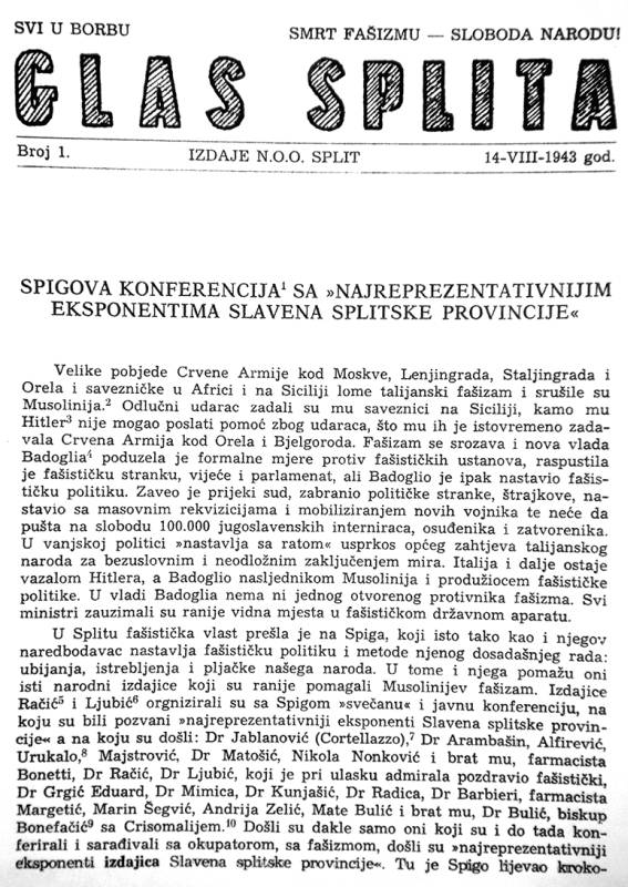- Uoči dolaska guvernera Bastianinija, aktivisti NOP-a su u Splitu protekle noći na Piazzale Nazario Sauro[1] bočicama crnila zaprljali zidnu tablu posvećenu ulasku talijanskih fašista u Split i table s nazivima sljedećih ulica: Via 15. aprile,[2] Viale della II. Armata,[3] Piazza Vitorio Emanuele III. i Riva Benito Mussolini.[4] Izvještaj Prefekture Split, Kronologija