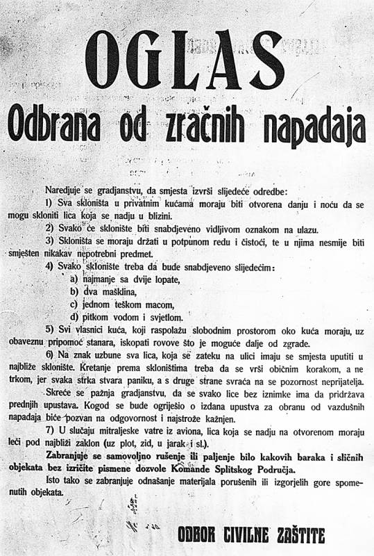 - Po gradu je ujutro afiširan oglas Komande splitskog područja, otkucan na pisaćem stroju, da se svatko tko ima oružja mora ga odmah prijaviti, tko je pak uzeo vojničke hrane, oružja, haljina, itd. mora odmah to vratiti inače će biti kažnjen. Zabranjeno je kretanje je po gradu od 7 sati navečer do 5 sati ujutro.
