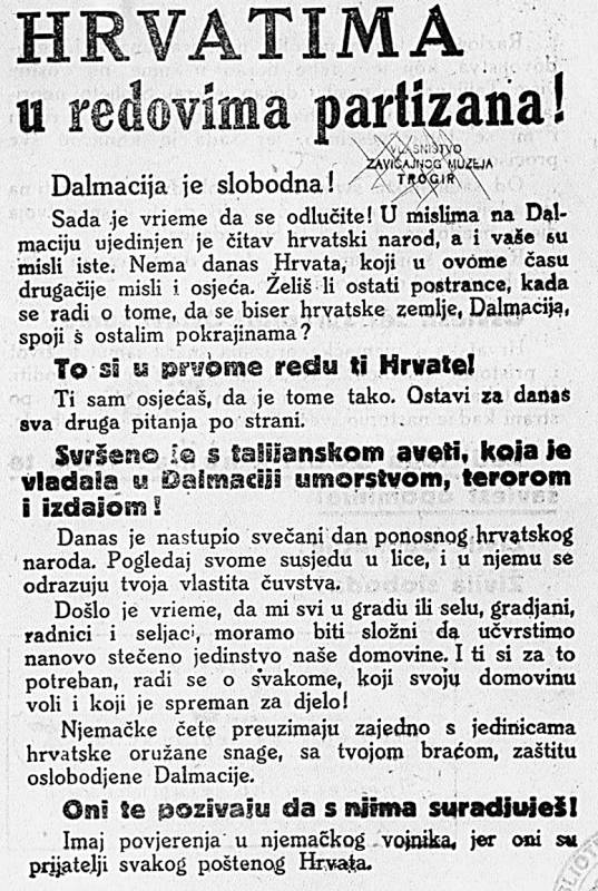 - U pozivu u borbu Pokrajinskog Nnarodnooslobodilačkog odbora Dalmacije i Štaba IV. operativne zone od 10. rujna 1943. narodu Dalmacije stajalo je: