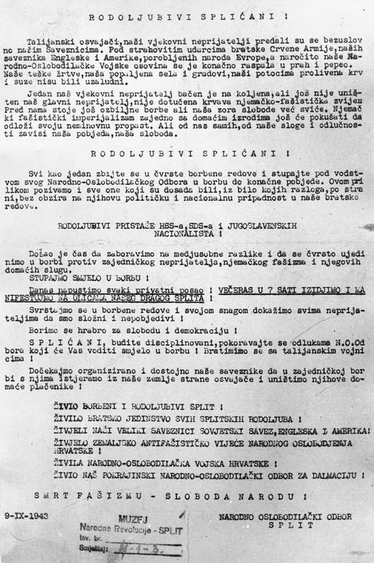ŽIVILO BRATSTVO I JEDINSTVO SVIH SPLITSKIH RODOLJUBA! ŽIVJELI NAŠI VELIKI SAVEZNICI SOVJETSKI SAVEZ, ENGLESKA I AMERIKA!