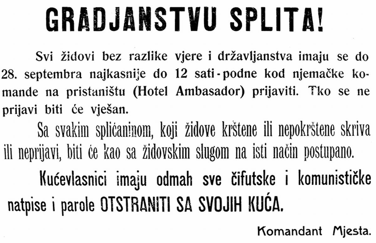 - Pozivaju se svi Židovi koji borave na području grada Splita, da odmah nakon izlaska ovog oglasa osobno dođu u Redarstvenu oblast i sa sobom ponesu po dva svoja svjetlopisa … Tko god se ovom pozivu ne odazove, bit će najstrože kažnjen.