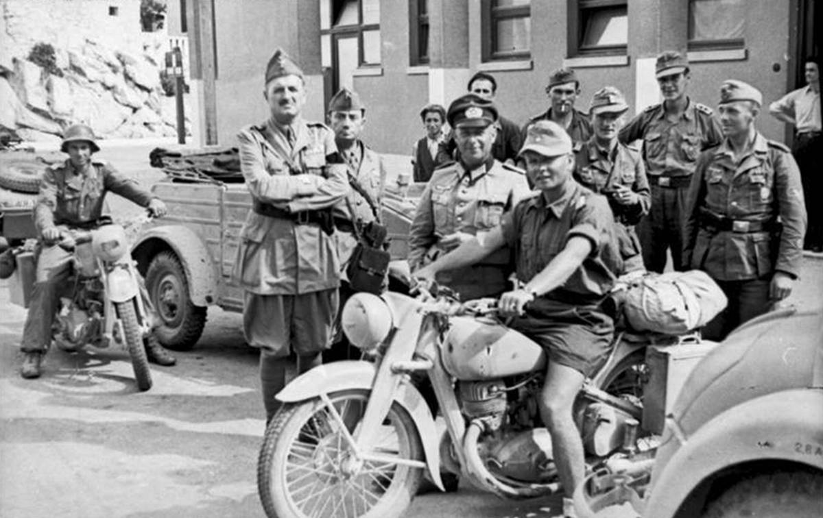 Njemačka okupatorska soldateska na ulicama Splita. Pripadnici SS divizije »Prinz Eugen« sjede na kornižu Rive iznad parole: Živila Crvena armija!