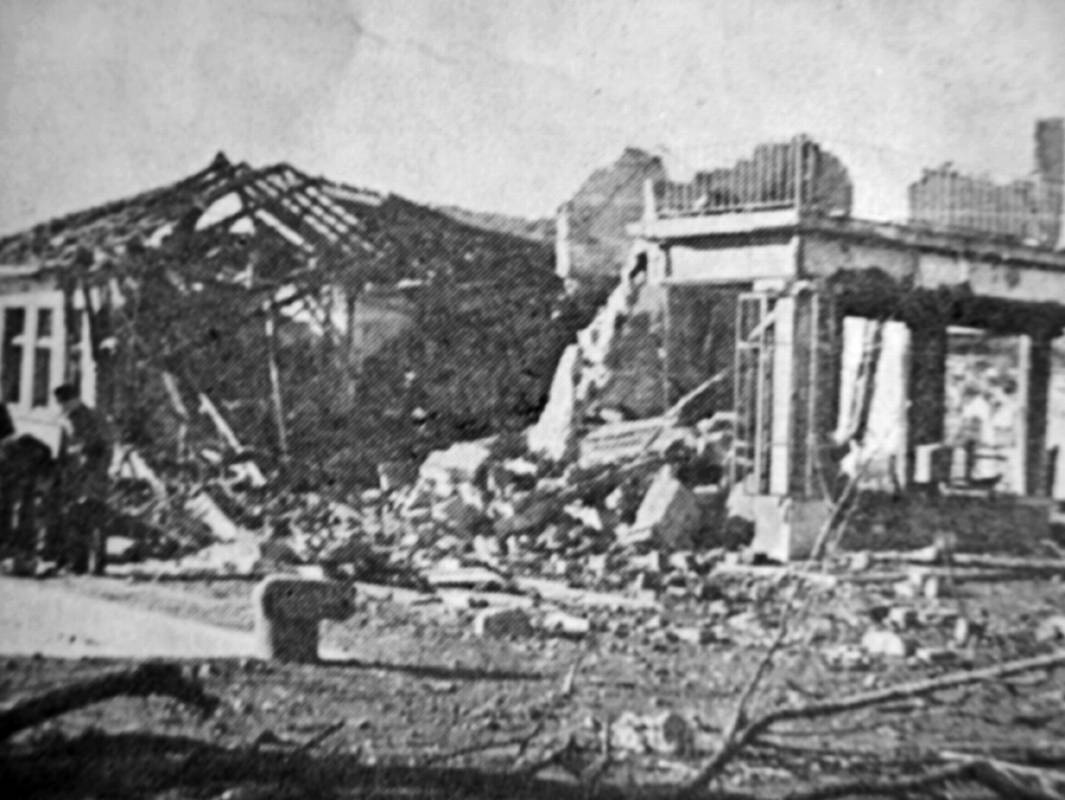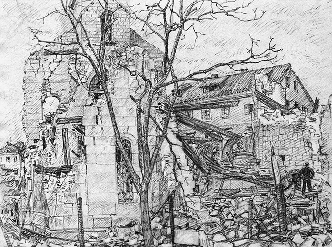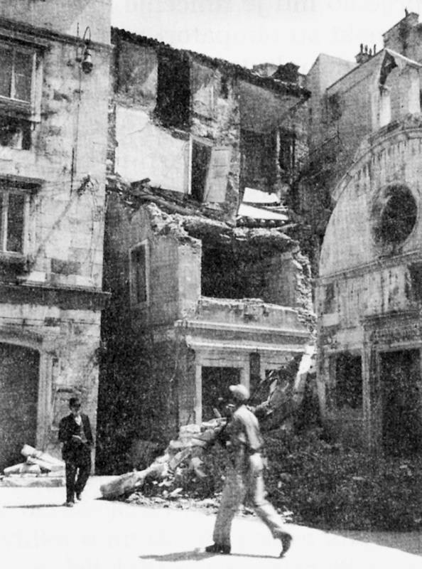 - Tek zadnje bombe prasnuše u našoj neposrednoj blizini i skrhaše do temelja susjednu crkvu svetog Roka s takvom orljavom, da smo mislili da nam se naša kuća ruši nad glavom, od pustih greda i kamenja koje je popadalo po krovu i ulici, i od rasprsnutih stakala u samom skloništu. Na ulici bijaše od dima i prašine zagušljivo i tamno kao u paklu. Pljujući žutu prašinu tražimo zraka i usred dana jedva raspoznajemo ljude u neposrednoj blizini. I svi trče, bježe, ne znaju ni sami kamo. Svatko traži svoje najmilije. Trčeći preskaču preko greda, kamenja i dijelova pokućstva razbacanih po našoj ulici. Već odvode prve ranjenike iz gužve. Bego