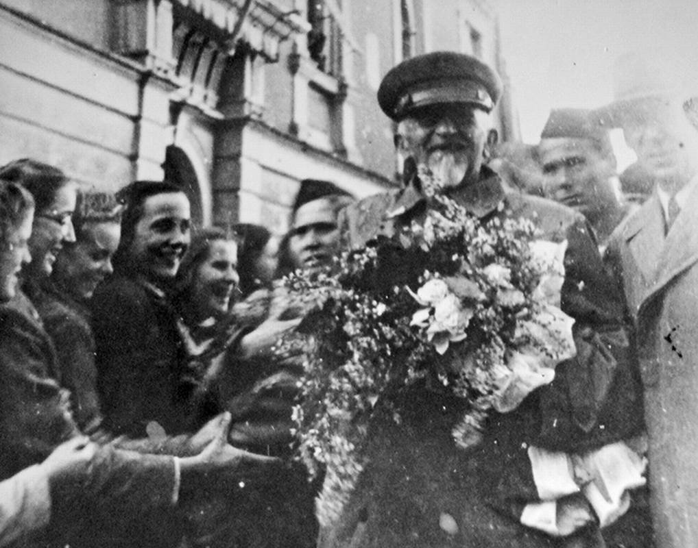 … Isto tako su oduševljeno pozdravljeni i odredi iskrcani s motornih lađa, koji su kroz gusti špalir naroda prolazili Obalom. Došao je i glazbenik Ivo Tijardović.