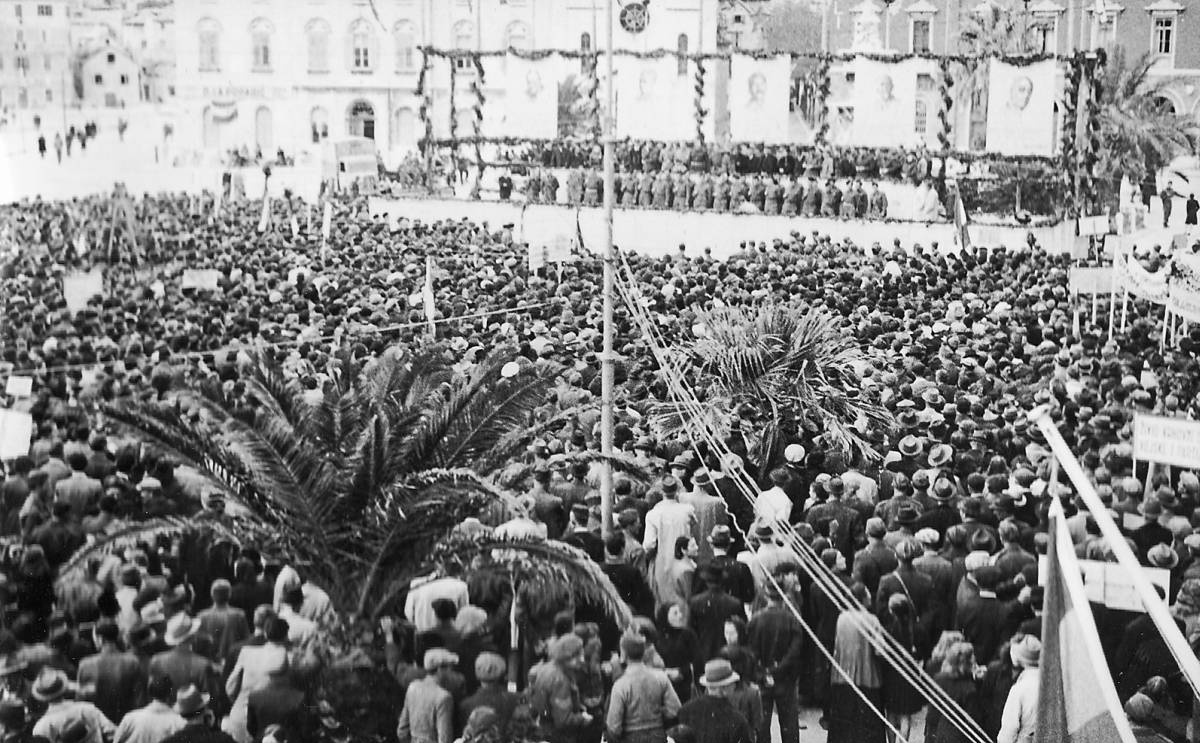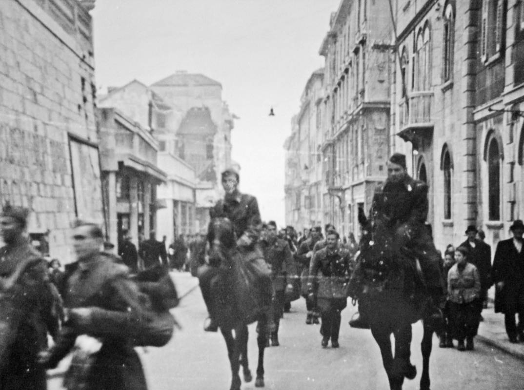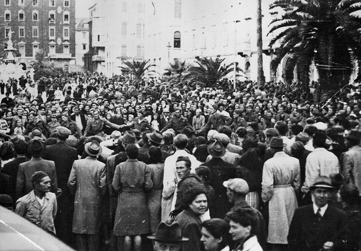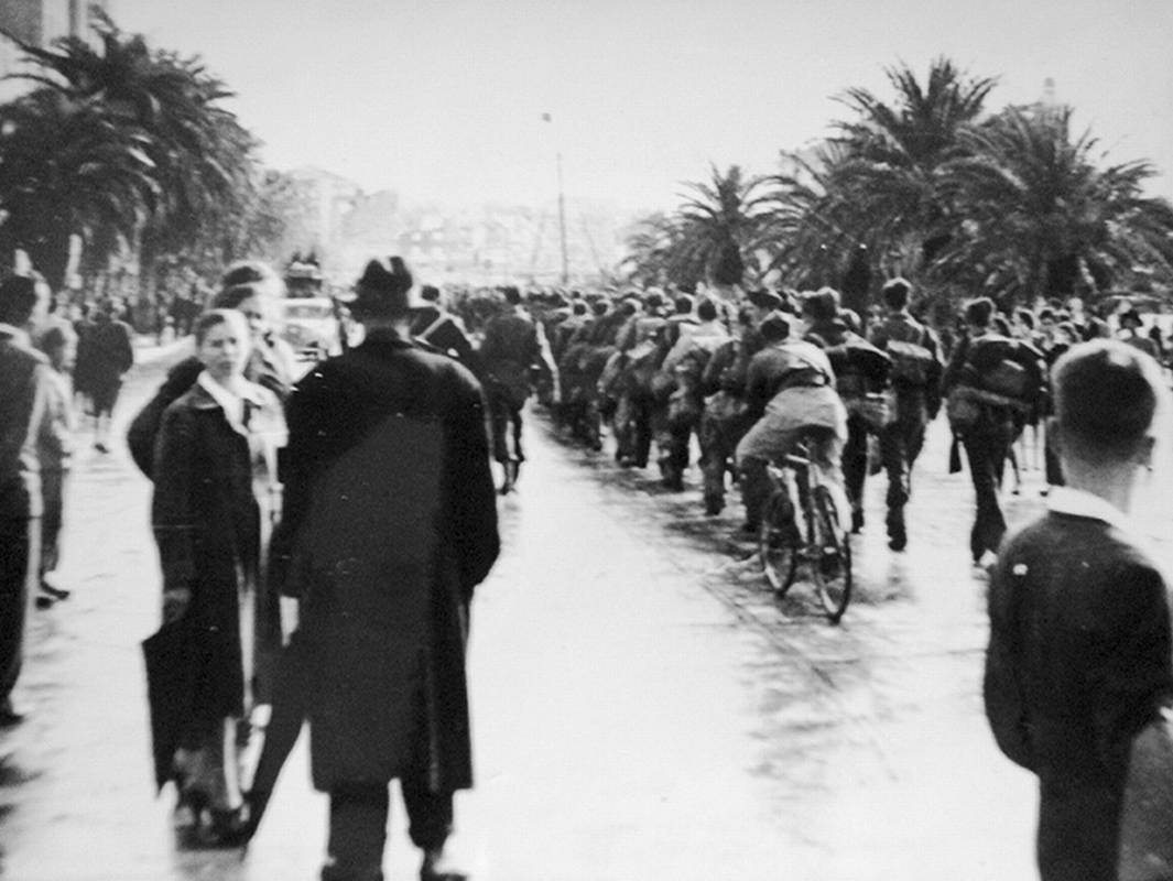 - Partizani iz pravca Žrnovnice promarširali su kroz gusti špalir građanstva preko Obale, koja je usprkos kiši bila prepuna. Promarširaše uz oduševljeno pljeskanje.