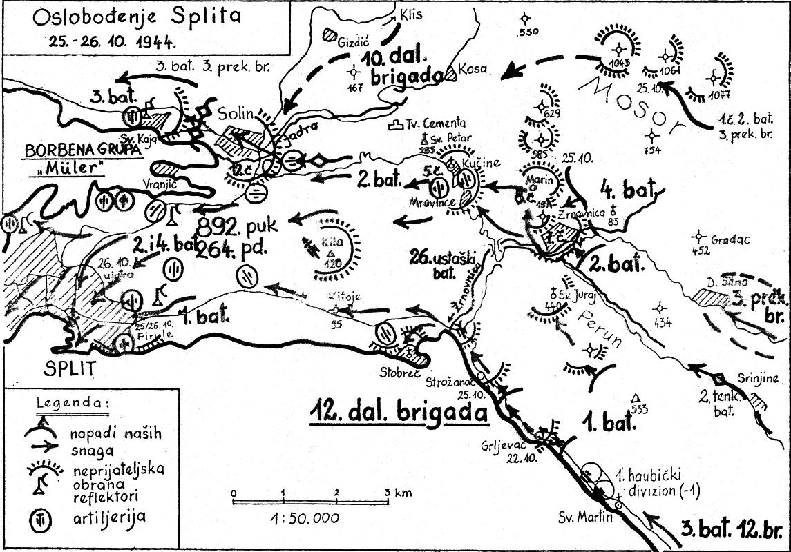 - U Split su ušle jedinice 10. brigade XX. divizije. U isto vrijeme dok se 10. brigada spuštala s Klisa prema Splitu, 12. brigada XXVI. divizije, pošto je slomila Nijemce u Strožancu, na Perunu i u Žrnovnici, ulazi preko Mravinaca tenkovima u Solin. Cestu prema Stobreču Nijemci su minirali, pa se s te strane nije moglo prići. Gizdić, 1944/1945., 689.