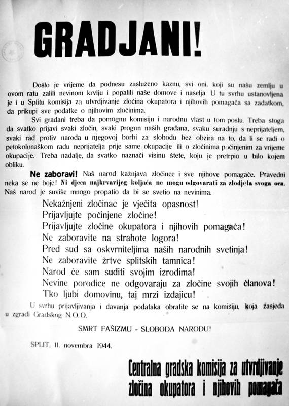 - Oglasom (bez datuma) pozvani su svi vojni obveznici rođeni od 1899. do 1908. da se prijave regrutnoj komisiji dana 2., 3. i 4. siječnja 1945. Ovaj se poziv ne odnosi na one koji su stupili u NOVJ prije oslobođenja Splita. Oglas je izdan od Gradskog NOO-a i Komande područja srednje Dalmacije.