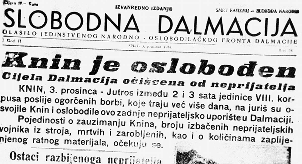 Iz Ratne Kronologije–PROSINAC 1944.: POSLJEDNJA NJEMAČKA OFENZIVA U ARDENIMA (16. PROSINCA) – POBJEDONOSNO ZAVRŠENA OPERACIJA OSLOBOĐENJA KNINA (ZAPOČETA 16. STUDENOG). KNIN JE DRŽALA NJEMAČKA 264. DIVIZIJA , OKO 14.000 VOJNIKA KOJA JE DOŽIVJELA TOTALNI PORAZ OD ČETIRI DALMATINSKE DIVIZIJE OSMOG KORPUSA NOVJ, ARTILJERIJSKE GRUPE I 1. TENKOVSKE BRIGADE, UZ ZRAČNU ZAŠTITU 1. ESKADRILE NOVJ IZ VISA (UKUPNO 55.000 BORACA, 25 TENKOVA, 11 OKLOPNIH AUTOMOBILA, 531 ATLJERIJSKO ORUĐE). KNIN JE OSLOBOĐEN (3. PROSINCA) ČIME JE OSLOBOĐENA CIJELA DALMACIJA