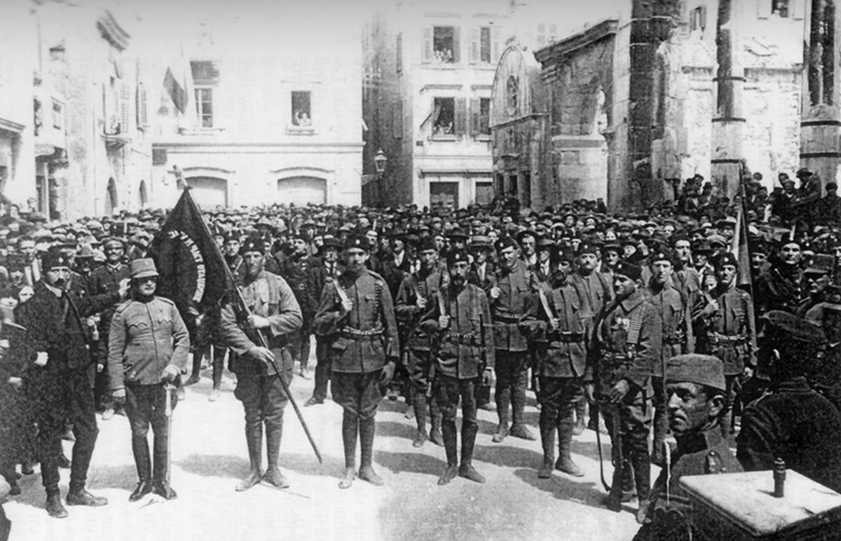 Postrojavanje četnika. Manifestacija Orjune na Peristilu 1924. Orjunaši su se posebno žestoko obračunavali s komunistima; Četnici na Peristilu dvadesetih godina prošlog stoljeća